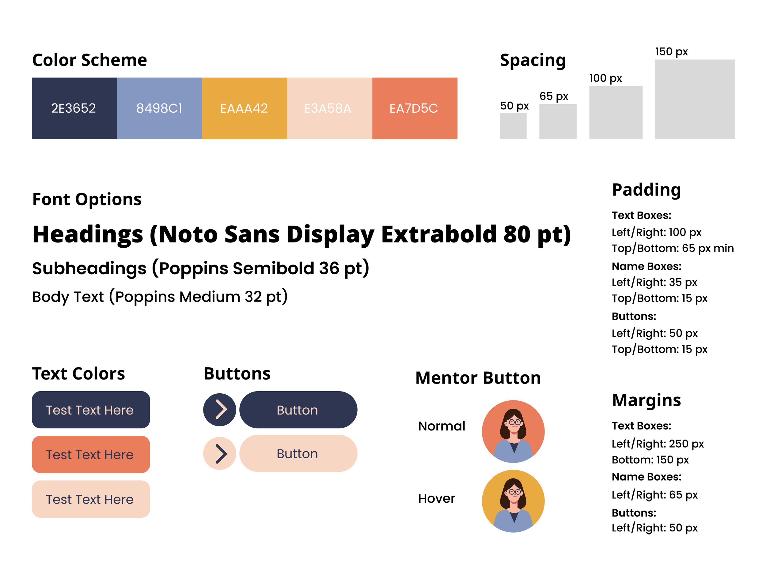 I then developed a style guide in Figma to create visual specs and maintain consistency of teh graphical elements throughout the learning experience. To create a calming tone to match this safety training, I chose a color scheme that was both saturated and soothing, sans-serif font families that are elegant and approachable, and character sets that are sophisticated and friendly.